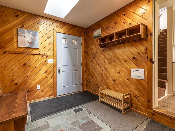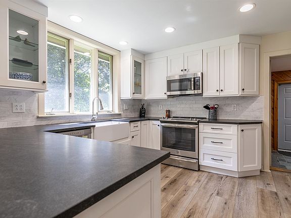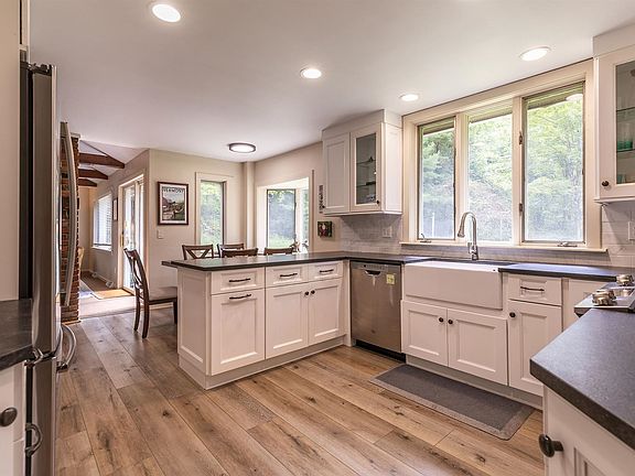 First impressions! A large, private, level lot with a small stream and mountain views, showcasing an artisan created Stonehenge fire pit; Light, bright home with large windows to enjoy the outdoors from inside; Newly exterior painted; Solar panels on roof; Electric car charge port in garage. (Tesla batteries in basement are leased) Mini splits on both levels for comfort in the summer. Come see this three bedroom, two bath home with attached two car garage with storage above on 2.20 private acres. The first floor features a recently renovated kitchen, living room with vaulted ceilings and exposed beams, primary bedroom, full bath, laundry, office/study with pocket doors and built in desk and book shelves. The second level offers two additional bedrooms, loads of storage and 3/4 bath. Two different patio areas for enjoying the outdoors, one is covered. So much to enjoy about this home, don't hesitate in coming to see it. PROPERTY BORDERS THE BIRD SANCTUARY-birds are frequent visitors.Scenic views of Howell's Pond in the winter.