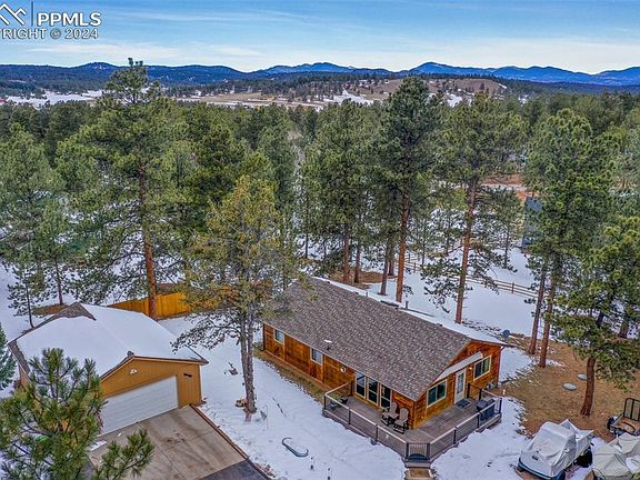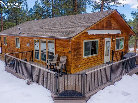 This home has been completely refreshed as new! The property shows like new and exudes pride of ownership! Located just 1/4 mile from the pavement in a neighborhood with architectural covenants, and community fishing ponds! Also, just 25 minutes from Woodland Park, 20 minutes to Cripple Creek, trout fishing is just 30 minutes away at the nearest reservoirs and rivers, and only 1.25 hrs to local snow-skiing and the Continental Divide. So many upgrades have been accomplished in the ownership of this home, to include: All new Window World windows throughout; granite countertops throughout + an undermount deep well kitchen sink and new faucet; new commodes and faucets in bathrooms + new shower glass door in the master installed; new ceiling fans fixtures; Vinyl plank flooring and carpeting; upgraded front door and storm door; oil rubbed bronze switch plates installed + all new door hinges and door knobs; Composite decking and powder coated railings + 13' retractable motorized awning; roof replaced in 2019: skylight and new gutters; interior paint; stove/oven and dishwasher; Heat N Glow freestanding natural gas fireplace; new furnace in 2022, just inspected and cleaned; asphalt driveway freshly sealed in 2024; oversized 25' x 30' detached 2 car garage + RV Parking & extra parking areas; Sprayed-in foam insulation added to the attic space, making the home highly efficient; Leaf Filter gutter guards added in 2024! This property is a gem, and is a don't miss opportunity, come take a peek!