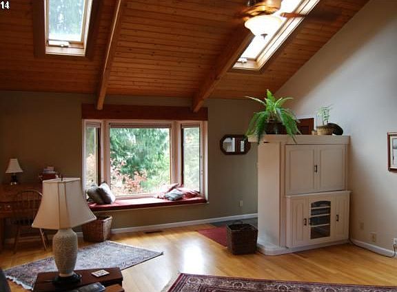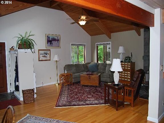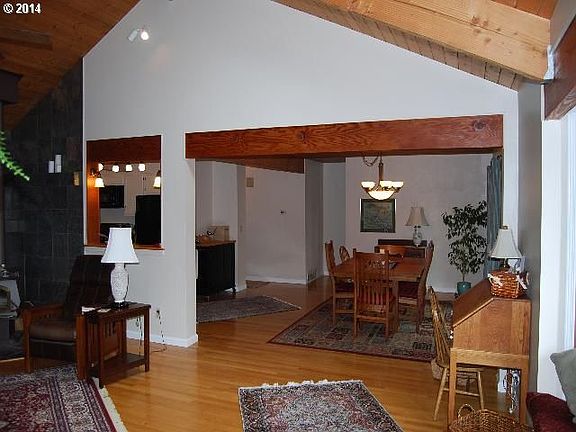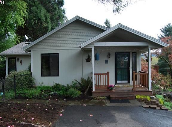 What a surprise inside! Vaulted tongue & grove ceiling, hardwood floors, open great room floor plan, master with access to back yard, beautiful patios & secluded yard to enjoy the outdoors. Home is loaded w/charm. New interior paint and composition roof 3/2014. Deck off front with view of Willamette River and surrounding terrain. Close to downtown historical Willamette.