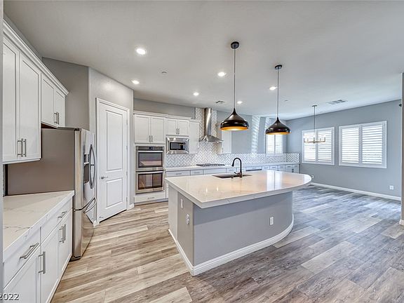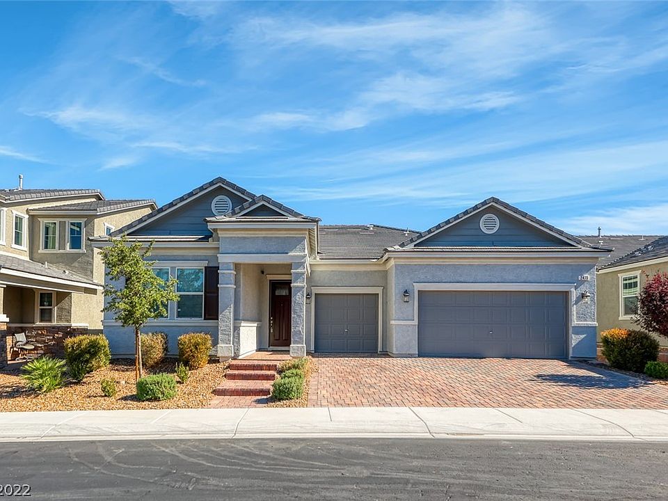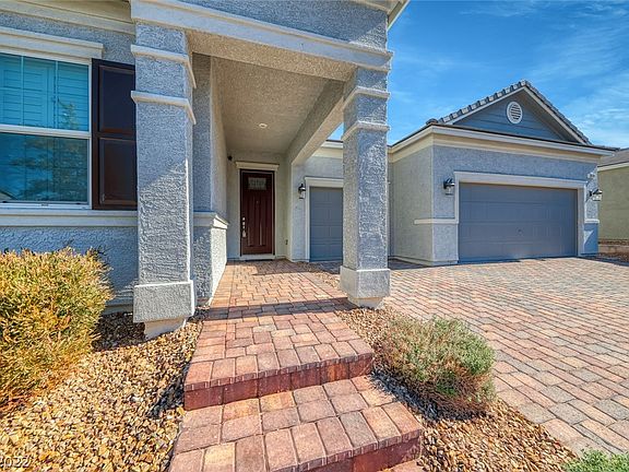 This stunning single-story home is nestled within a gated community in the desirable Inspirada master plan, which offers amazing amenity-packed parks & endless activities for a dynamic lifestyle! Picture yourself living in this stunning home that is loaded with upgrades! Featuring waterproof luxury vinyl plank floors throughout, gourmet kitchen with dining area for quiet nights at home or for entertaining, white cabinets, quartz countertops, huge kitchen island w/ pendant lighting, stainless steel appliances, double ovens, wine fridge, subway tile backsplash, walk-in pantry, wood shutters, open-concept design w/ spacious great room, split bedroom layout, Primary Bedroom w/ two walk-in closets, walk-in shower & separate tub, dual sinks & upgraded mirror, ceiling fans in all bedrooms, two-tone grey paint, three car garage w/ epoxy flooring, tankless water heater & water softener. Enjoy the evenings from your back covered porch with stone paver patio, ceiling fan & built-in outdoor grill!