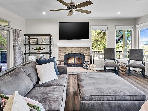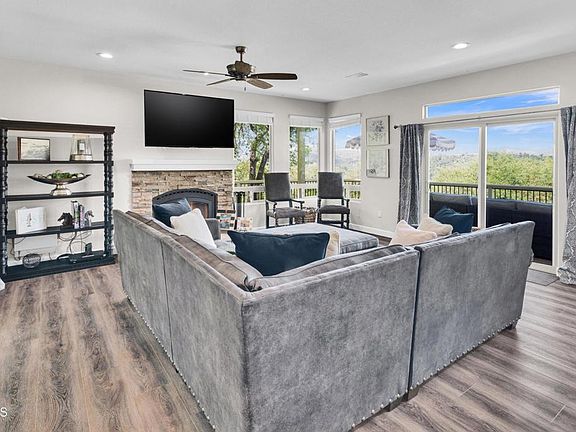 Enjoy breathtaking panoramic mountain views from this beautifully updated multi-level home, designed with an open-concept floor plan that maximizes natural light and indoor-outdoor living. The spacious great room boasts a cozy fireplace and seamlessly connects to a chef's kitchen featuring repainted cabinetry, new appliances (2020), and elegant leathered quartzite countertops. Large windows and sliding glass doors flood the space with light and open to two spectacular outdoor living areas--a front solid-surface deck perfect for entertaining, and a tranquil rear covered composite deck nestled into the hillside landscape. On the next level down, you'll find a guest bedroom and bath, along with the luxurious master suite offering serene views and a spa-like bathroom complete with a large walk-in shower. The third level offers an additional sleeping area and a massive garage, which currently houses a large wakeboard boat with a tall tower. The garage--approximately 30' deep by 20' wide, with a 10' high door and 13' ceiling height--also accommodates a golf cart and jet skis with ease. This home was tastefully remodeled in 2020 with new baseboards, carpet, luxury vinyl flooring, modern fixtures, can lighting, new paint, and a new water heater. Lovingly maintained and never rented, it has also been professionally cleaned on a monthly basis. Most furnishings and decor are included in the sale making this a truly turn-key opportunity.