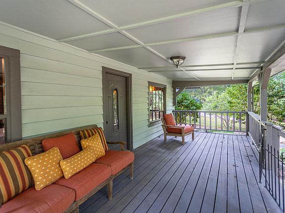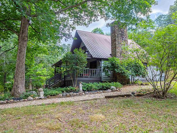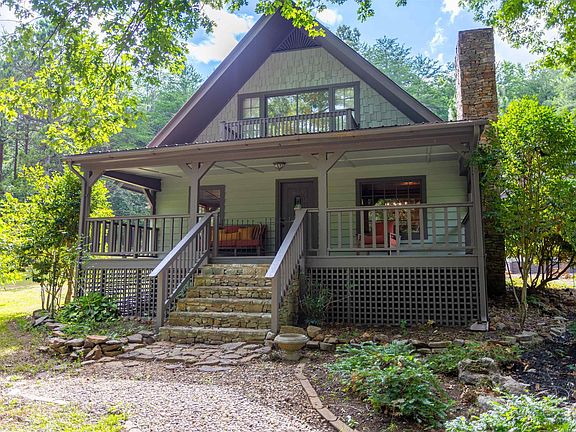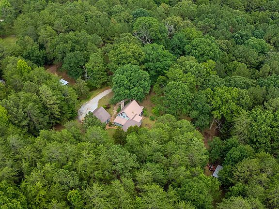 Secluded mountain home nestled on nearly 7 acres abutting Talladega Forest, w/ views of deer and turkey from the lg front porch. Spacious living and dining room w/fieldstone fireplace, tongue & groove pine shiplap walls, and rustic beams. Kitchen includes custom-built cabinetry with granite countertops, lg farmhouse sink, ample storage, and an island with a hammered copper top. The home includes 3 bedroom suites: the first main-level suite has a living area with a wet bar, an office/library, a bedroom, and a full bath; the second main-level suite is near the laundry and features a full bath; and the upper-level suite has a balcony deck, a full bath with a Carrara marble top, and generous storage. There is a mudroom, laundry room, and lots of storage throughout. Apartment above the 2-car garage offers kitchenette, living area, bedroom, full bath. fruit trees scattered throughout the landscape. Duggar Mt is just 1/4 mile down the road. HVAC and exterior paint new in 2022.