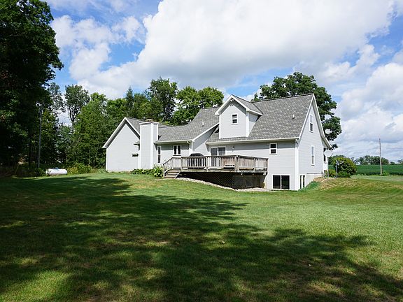 Beautiful Spacious home on 14 acres. Home is impeccable and has all the aspects you are looking for. This parcel has just the right mix of woods, yard space and pastures. Upon arrival you will notice the cement drive with large turn around, the attached garage is extra deep and finished, covered front porch with room for the porch swing and rocking chairs. Main floor living made easy with the master suite, den, laundry, living room, kitchen, pantry, dining and extra storage in the hall walk incloset. Custom features include wood fireplace with stone surround in the den, solid wood doors and trim, hardwood floors in the kitchen and dining, tile flooring in 1st floor and lower level baths, quartz counters with tile back splash in the kitchen, finished basement, large deck with hot tub and multi-use barn. Master suite has walk in closet, master bath, carpet and ceiling fan. In the Master bath you will find double sinks, jetted tub and shower.