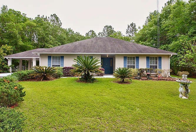 3 bedroom/2.5 bath sturdy concrete block home conveniently located in desirable & serene Newberry Hills community. Comfortable great room & split floor plan with separate entrance perfect for home office, Rec room or In-law suite. Large 2-car carport with kitchen entrance. Spacious 1.14 acre fully fenced wooded lot offers privacy & security with gated entrance, separate dog run & lots of parking. Oversized sunroom, screen enclosed patio, elegant landscaping & large workshop/storage building. Move-in ready. Exceptional value, needs only some updating!