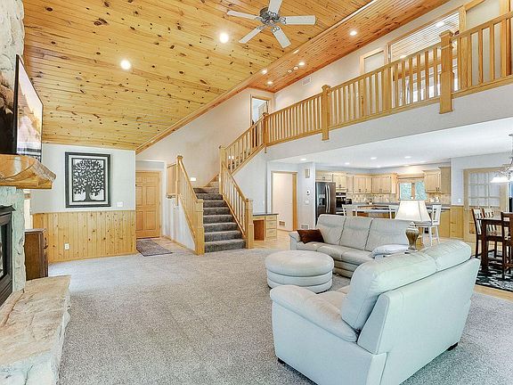 Entertainers Dream!! Expansive and open concept main level including a huge kitchen with solid surface countertops, massive center island and updated appliances, tongue and groove vaulted living room with two-story stone fireplace. Beautiful knotty pine four season porch overlooking the backyard and walking out to the deck. Massive 19 x 19 upper level primary suite with soaking tub, double vanity and huge walk in closet. Gigantic lower level family room with gas fireplace, extensive built-ins, wet bar area and a large storage/utility room. Easy opportunity for a fifth bedroom. New furnace and AC in 2023. Fenced backyard. Almost 4000 finished square feet, close to schools and parks with easy access to I94. Must See!!!