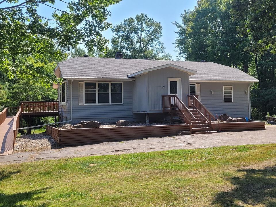 Private wooded setting on 10 acres only 3 miles south of Sandstone. 3BR 2Bath home plus 56 x 40 garage/shop. Great equity builder! New master bedroom with vaulted ceiling and tongue/groove. LR with laminate floors and bay window. Large open kitchen and informal dining with access to huge deck overlooking woods. New mud room and a walk out lower level from utility room/laundry area. Extras include horseshoe driveway, chicken coop, and generator shed. Garage shop is insulated and heated by electric and/or wood stove. Great location just north of metro 90 miles, north of Hinckley 7 miles.