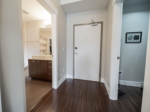 Stunning 1 bedroom plus DEN w/ 9 ft ceilings. Located in the heart of downtown Port Coquitlam surrounded by all the conveniences you could want. Cross the street to Gates Park & Coquitlam River. Short walk to Westcoast Express Train, Shopping, Restaurants, Patina's Brewing, Groceries, all levels of School, PoCo Trail & more. Inside, you will notice the pride of ownership. Open the door, step inside to the large entrance and say WOW. Large windows fill this home with so much light & happiness. Open concept kitchen offers quartz counters, two tone kitchen cabinets w/ floor to ceiling pantry, breakfast bar seating & SS appliances. Mstr bdrm is large enough for a King w/ a big walk-in closet. Bathroom is extra long with lots of storage. 1 Prk + Lkr. Rentals and pets welcome. This is home!