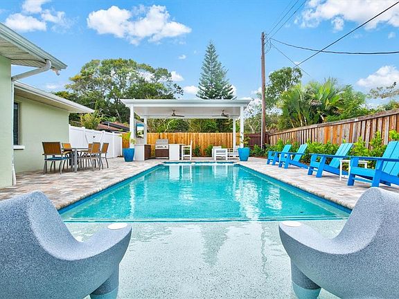 Turn-key Furnished with 38ft heated saltwater pool and spa, fully fenced yard, putting area and outdoor kitchen! Welcome to The "Retro Ringling" house, a unique designer home in downtown Sarasota with tons of modern amenities and nostalgic charm- all within a stone's throw from Main St Sarasota, Payne Park and Legacy Trail & just a few short miles to the white sands of Siesta and Lido Beaches. There's room for everyone in this 1954 built ranch style home with wide open floor plan and more natural light than any home you're likely to visit. The Retro Ringling has a front to back living room with seating for 8 people and enormous Jalousie windows that capture the romance of the time. The house comes turn-key furnished! We've appointed the house in mid-century modern designer furniture while preserving the original terrazzo floors and custom tile work in the kitchen and baths. Our home is designed to transport you to a simpler time. Located on a quiet street in the historic Ringling Park neighborhood this home is classic, cozy and convenient. The living room centers around a 65 inch 4K Smart TV with ability to connect to Netflix, Amazon Video and other subscription services using our 200 mbps internet speed. Seating around the TV includes one leather couch, one upholstered queen sleeper sofa, 4 cushioned chairs and 2 bar stools. You will also find a vinyl record player with some classic albums, an oscillating Vornado fan as well as a retro bar stocked with board games and other goodies for all ages. There are 2 bedrooms and 2 full bathrooms as well as a separate cubby space that acts as a 3rd bedroom, (the Siesta Room) with a twin futon. All beds feature premium Lucid Mattresses and hotel grade bedding. The bed configuration is as follows: Bedroom 1: 1 queen bed (Sleeps 2); 2 full beds (sleeps 2 adults or 4 kids) Bedroom 2: 1 King bed (Sleeps 2) Siesta Room (3rd Bedroom): 1 Twin bed (Sleeps 1)- Linens in Orange Cube next to bed. Living Room: 1 Queen Sleeper Sofa (Sleeps 2)- Linens in hallway closet. Both bedrooms have large empty closets with hangers as well as dresser space and nightstands with bedside lamps. The Master bathroom offers a tub/shower combo and the 2nd bath is smaller with a walk-in shower. The eat-in kitchen will make you smile. There's seating for 6 around a retro tulip table and and the beachy mint tile counters and backsplash set the stage for a brand new Big Chill 1950s style refrigerator with ice maker. There's also a range/ oven, microwave, toaster over, spice rack, knife block set and coffee maker. The Florida room is spacious with a dining table for up to 8 people and a separate seating area with room for 6 more centered around a 50 inch 4K Smart TV on a swivel mount. This room is not air-conditioned however two ceiling fans provide some relief in the hotter months. This room also has a dart board and a cornhole set to be used out back. Full laundry is available in the garage as well as an iron and ironing board and bench top for folding your clothes. We have a large private, fenced back yard with brand new saltwater pebble tec pool and spa. The pool has also sunshelf with bubbler. There is a mini golf area, a cornhole area and a covered outdoor kitchen. Dogs are allowed with pre-approval and proof of flea/tick treatment. The Retro Ringling offers the best of urban residential living with close proximity to all of the best restaurants and beaches but with room to spread out on a fully fenced private lot.