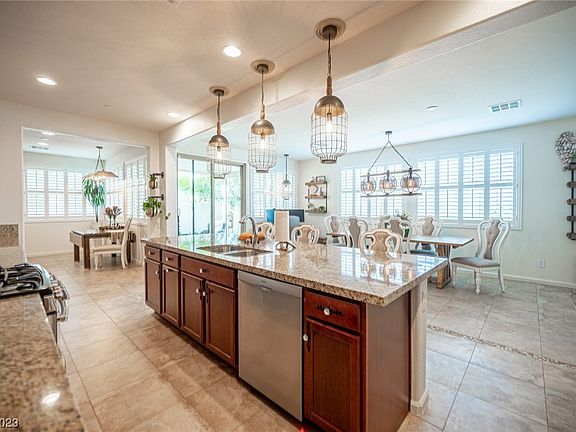 Beautiful 4 bedroom home shows like a model in highly desirable Inspirada. Pride of ownership with all the custom touches. Walk into a cozy entryway and take in the bright and airy living room showcased in windows with white shutters. Back of home overlooks walking path. Family room kitchen area is displayed as a large rustic kitchen with a large granite island. Kitchen and living area both have views of the peaceful yard. Yard has pavers and covered patio. Low maintenance plants. Three rooms have electrical and cable discreetly moved high on the wall. Upgraded smoke detectors. New Stainmaster carpet, interior paint and Bosch dishwasher in the last year. Conveniently located near schools, parks, walking paths restaruants and shopping. This home is clean and move in ready!