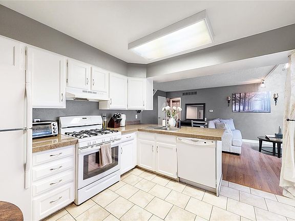 - Description: Spacious Kitchen With White Cabinets And Appliances And Sliding Glass Door Access To Patio