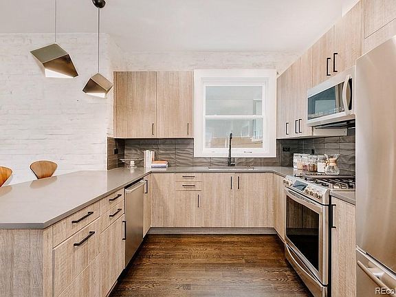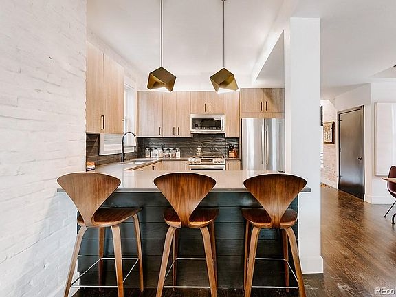 The old bones of this flawlessly formed home have been retouched with contemporary updates. The overall style is a warm modern that pays homage to the original characteristics of the house. The enticing black and white façade highlights an arched window that is placed in the industrial-inspired living room with white brick wall. The exposed brick leads into the updated kitchen complete with stone countertops, stainless steel appliances, and island seating. The dining room has a striking hardwood ceiling that matches the hardwood floors seen throughout with a slender window flooding the room with light. The entire dwelling boasts four sun-kissed bedrooms and four bathrooms. All of the bathrooms have a similar scheme of wall-to-wall white stones that reach up the walls. The master suite is a showroom in itself with geometric, high ceilings, exposed brick, an en-suite bath with a walk-in shower and a large vintage closet with creative nooks. 2473 West Caithness Place is nestled between Highlands and LoHi where restaurants, coffee shops and stores line the streets, and plenty of parks are a quick jaunt away.
