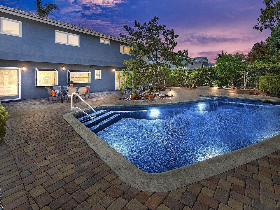By the time you are done reading this, the home will be gone! HURRY! This home will make you feel like you are vacationing at a resort, but it is not a dream it is YOUR home! This beautiful turnkey home features 4 bedrooms, 3 bathrooms and a BIG gorgeous backyard with a sparkling swimming pool and mini spa! Enter into the lovely front doors of the home and you are greeted with a vaulted ceiling and skylight. The warm living area features a new stacked stone fireplace and front bay window. Alongside the living area is the formal dining area with decorative hanging lights and glass sliding doors leading to the backyard. The updated kitchen has windows that allow you to see the breathtaking backyard and landscape artwork. Also downstairs offers a large room that can be used for a bedroom, bonus room, office, etc with a private entrance into the backyard. Upstairs has the is the master bedroom with a large walk-in closest and wonderful view of the backyard and surrounding area. The master bath offers dual vanity sinks and tub/shower. There are two more bedrooms upstairs plus an additional full bath with dual vanity sinks and tub/shower. The garage is oversized and tall enough to fit a small RV. Summer is here and this home has the perfect layout and backyard for entertaining family and friends. It is time to come to Paradise! The home is close to the freeway, local schools, shops and restaurants. Very low tax rate, no Mello Roos & very low HOA for the Mission Viejo Racquet Club.