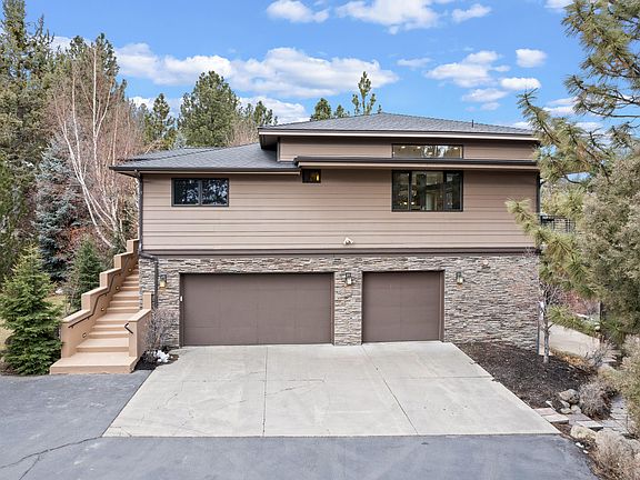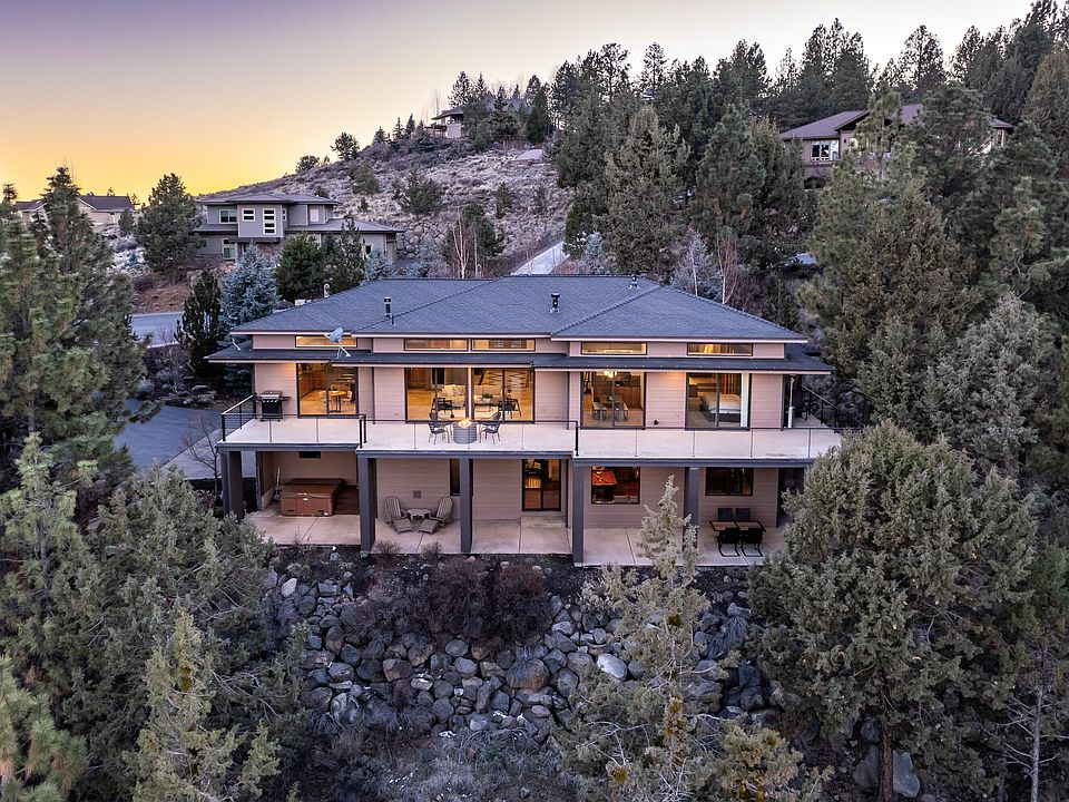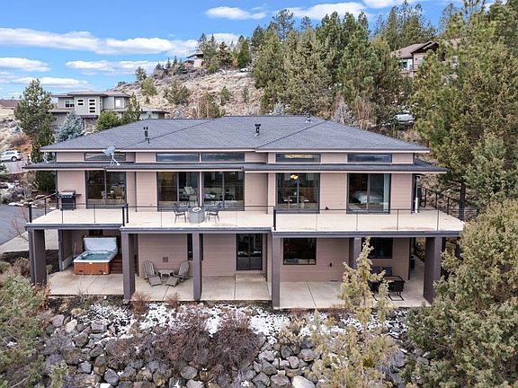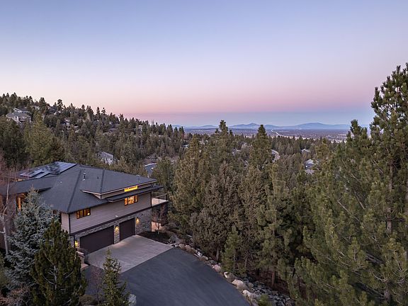 Stunning PANORAMIC mountain & City VIEWS from this Awbrey Butte contemporary home. Open floor opens to a huge deck perfect for entertaining. Chef's kitchen w/large island, hickory cabinets, granite counters, Viking refrigerator/freezer, 4 burner gas cooktop w/griddle, Bosch DW, Thermador microwave & oven, built-in wine cooler & walk-in pantry. Spacious living area & dining room w/see-through gas FP. Large primary suite w/access to deck, gas FP, Kohler infinity tub, dual sinks, walk-in tile shower, radiant floor heat & 2 closets. Main level has a guest room, full bath and office w/built-ins. Downstairs offers 2 bedrooms, bath, laundry room, theater room w/6 chairs, projector & screen, bonus room w/wet bar, kegerator, DW, big screen TV & pool table. Smart features include LED lighting and 24 built-in speakers controlled by Sonos app. 3.8 kilowatt solar power system (owned) & AC. Huge 3 car garage (988 SF) built-in cabinets. Covered patio off bonus room w/hot tub.
