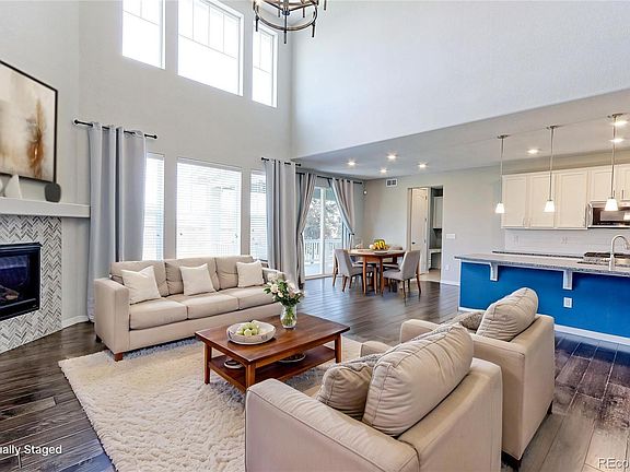 This former model home blends thoughtful design with stylish comfort, offering an open floor plan perfect for both everyday living and entertaining. The inviting family room features soaring vaulted ceilings, a cozy gas log fireplace, and dramatic floor-to-ceiling windows that fill the space with natural light. The gourmet kitchen is a chef’s dream with granite countertops, a gas stove, walk-in pantry, extensive cabinetry, a breakfast bar, and an adjoining dining area for seamless meals and gatherings. A main floor bedroom, full bath, and a custom study nook with built-ins add flexibility for guests, work, or hobbies. Downstairs, the fully finished basement expands your options with a spacious family room, wet bar, additional bedroom, and a dedicated workout or craft room. Retreat to the vaulted primary suite with a generous walk-in closet and a private five-piece bath. Outdoor living shines with an expansive deck and patios ideal for entertaining, a dedicated BBQ space. A 4-car attached garage offers exceptional storage and workspace. Enjoy engineered hardwood floors, stunning views of Longs Peak, and easy access to highways—everything you need for comfortable, convenient Colorado living.