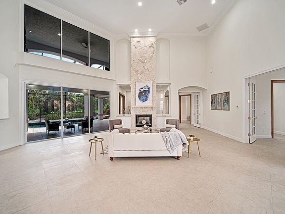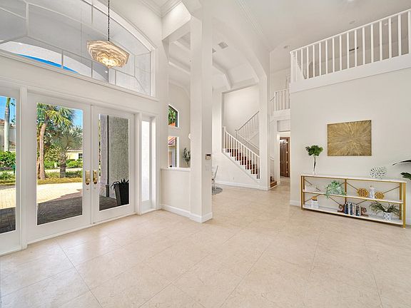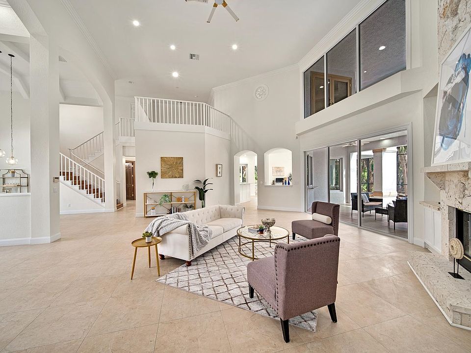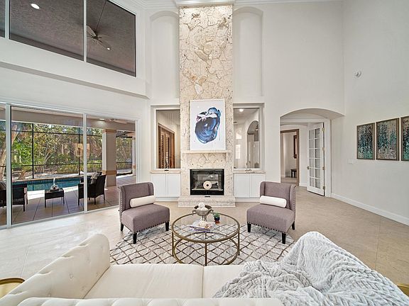 An exceptional offering at The Sanctuary, with beautiful views overlooking the 15th fairway towards the east, alongside ample privacy from this deep beautifully vegetated location. Upon entry, you will be captivated by the soaring 20 foot ceilings with an exquisite rare coral rock facade. Newly landscaped with an opened up view, your eye is immediately drawn through the main living area toward the expansive covered lanai space featuring a freeform Italian stone lined pool, along with a spacious backyard. Featuring two primary suites, owners will have the option of one on the main level and an additional on the second level. The kitchen is newly remodeled, and also lives beautifully with a second living / den area affording pleasant views with a panorama wall of windows. Members of The Sanctuary will enjoy Arthur Hills championship course, tennis, pickle ball, lap pool exercise center, exceptional dining and more. New owner will also benefit from the new standing seam roof, new custom Kitchenaid fridge, custom closets for downstairs bedrooms, new paver driveway and new pool equipment including heater. This is an eclectic beauty!