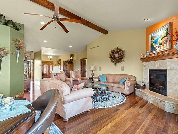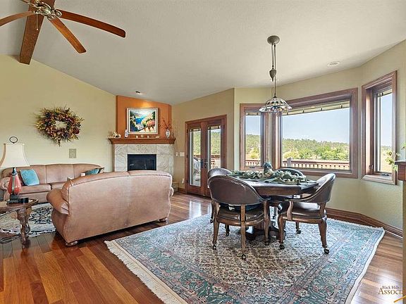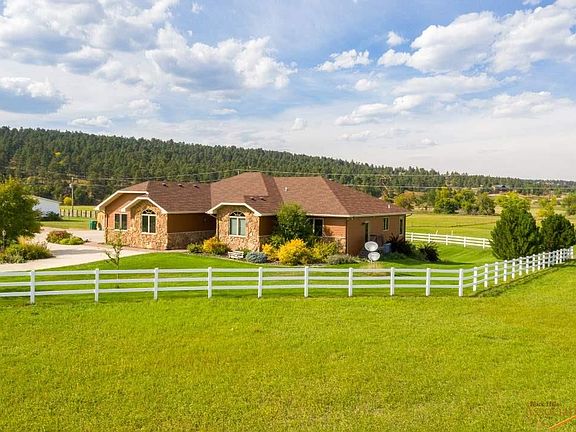 Custom built Ross Jones home with 21 acres on Coolidge Creek near Hermosa. Over 4700 total sq ft. Custom kitchen has Cherrywood cabinets, large pantry, heated tile floor, center island & granite counters. Teak hardwood floors in great room with gas fireplace. Formal dining and breakfast nook. Large master suite with jet tub, walk in shower, heated tile floor, & great closet space. Guest room and handicap accessible guest bath on the main level. Two atrium stairwells to walk out lower level. Mostly finished lower level includes large office area, guest bedroom, bath, theater room, lots of storage space & a sauna. The property is horse ready & has access to the creek. 30x40 pole barn. Large maintenance free deck with a propane line for grilling and nice covered patio area for entertaining. Short drive to Custer State Park and less than 20 minutes to Rapid City.