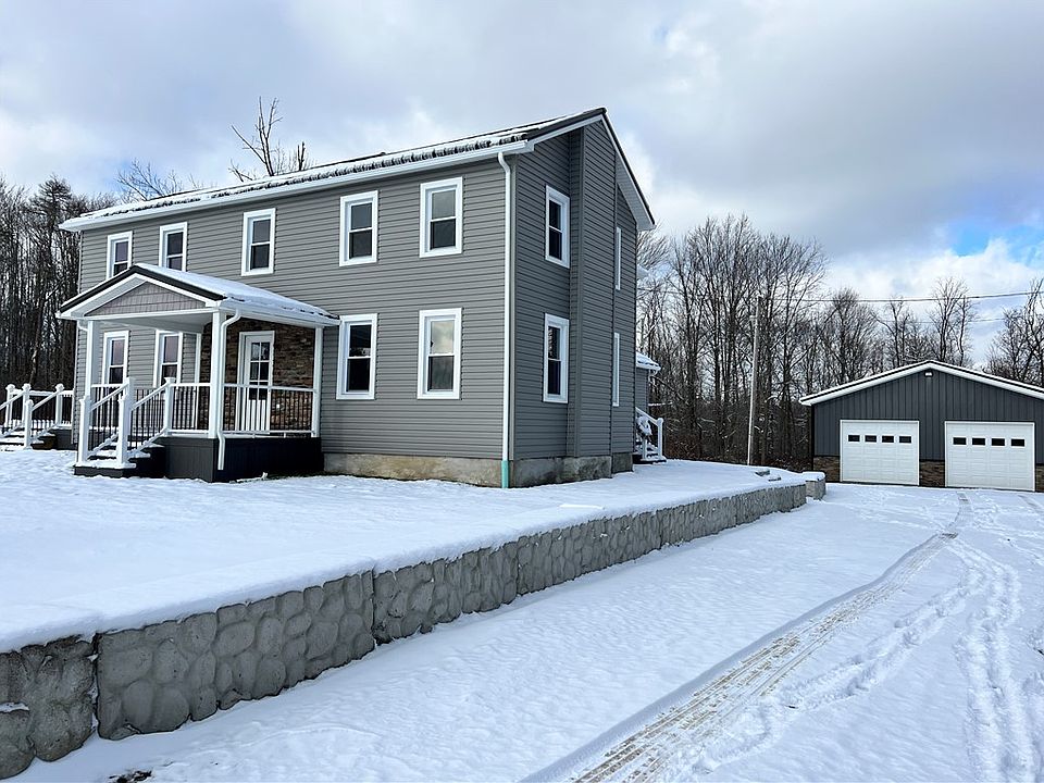 Beautiful, ALL NEW inside & out, 5 bed/3 full bath, 19 acres, new 4 car detached garage. Large, open spaces, new custom kitchen, formal dining room, breakfast nook, sitting/office nook. 1st floor laundry/mud room. Huge master suite w/walk-in custom shower. Decorative fireplaces, barn beams & stone accents maintain early 1900's charm in this modernized home. Stainless kitchen appliances on order. New metal roof, 3 composite decks, walk-out basement. Close to town country living just for you!