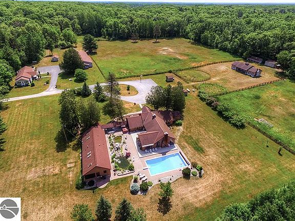 There are so many opportunities with 3 homes on this property plus a bunkhouse, workshop, storage building, stables, barn and carriage house. Main Home is 2700' with 4 bedrooms, 2 baths, ample storage, beautiful log living room with fieldstone fireplace, there is an equally beautiful kitchen with ample counter space and expansive great room with another fieldstone fireplace and billiards room. Also included is a 20 x 40 heated in-ground pool and patio with 2 beautiful koi ponds. 2nd home is 1500' and has recent updates. There is a large master bedroom, guest room, 2 baths and beautiful large sun porch. It also has a large deck with a sunken fire pit to relax by. Guest House is 1465' built in 2008 and recently updated. It has 1.5 bathrooms, a beautiful living room and kitchen plus a 3 season porch! It is handicap accessible. Being adjacent to the main house provides your guests easy access All homes are protected by a Generac backup generator; and, there are 4 wells on the property. Other buildings include: a heated workshop (960') with an attached storage barn (3200'), a Bunk House (266'), 2 Stables with a tack room (2052''), Pole Barn (484) and grooming area (317'), large cooler/butcher building (302') also a carriage house, feed room, training rings and pastures. There is a large and well maintained trail system allowing for easy travel around the heavily wooded property. If 243 acres is not enough, there are 20,000 acres of nearby Huron National Forest available for recreation. Wildlife viewing or hunting on this property is excellent and the several food plots encourage their visits.