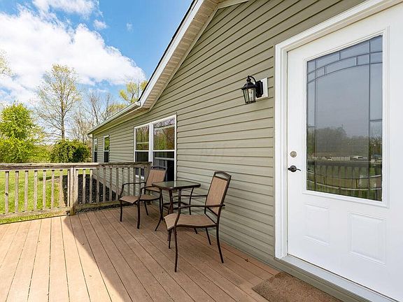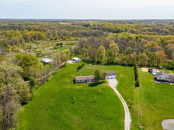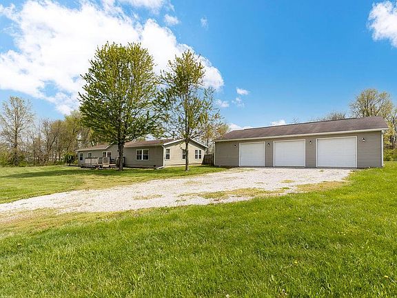 Check out this fantastic 3 bed, 2 bath manufactured home with real wood (hickory) floors, two living areas, and a HUGE detached, insulated 3 car garage with its own electric panel, all on 5 acres in the Highland school district. Half the property is wooded with trails cut through the woods. Open concept kitchen with island, stainless appliances, and maple cabinetry. Beautiful stone fireplace with wood burner. Home was renovated in 2014 with new roof & gutters, mechanicals, drywall, 6 panel doors, and amazing owner's suite with dual sinks and tiled walk-in shower. Washer and dryer stay. Delco water and Spectrum for internet. Great neighbors! OPEN HOUSE on Saturday, 5/14, 1 to 3pm. See you there!