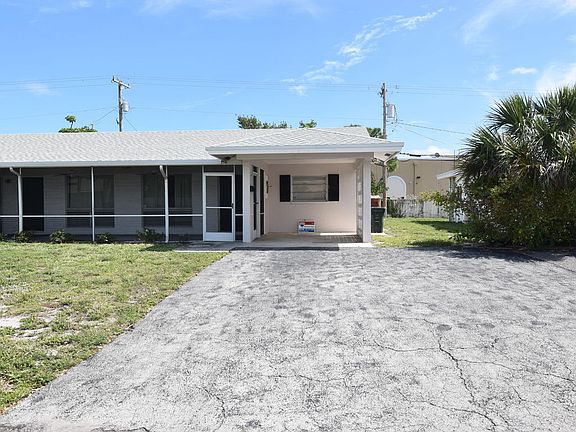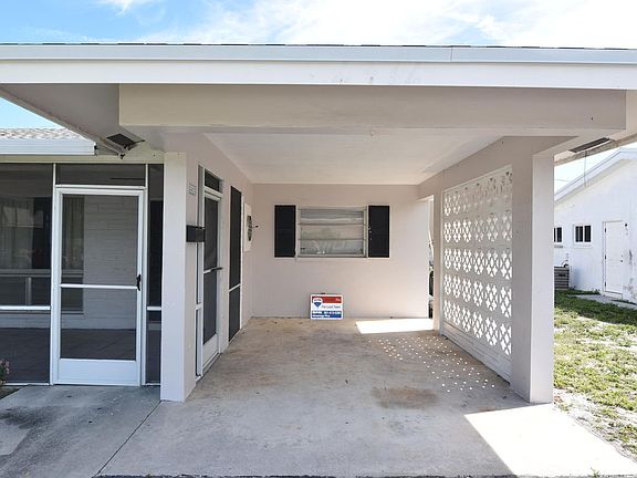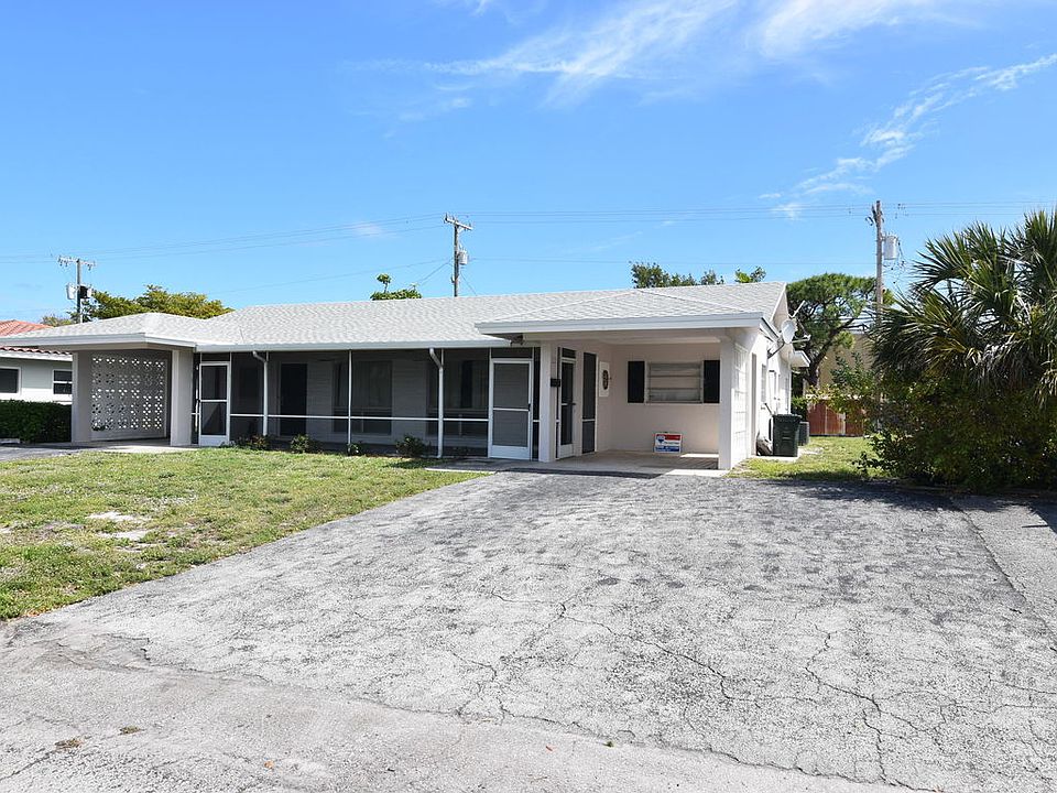 Spacious 3/2 with front & back patios in Boca Woods! Walk in through the screened front patio to a very spacious living room area. Terrazzo flooring throughout. Updated kitchen with s/s appliances and a granite counter top. Master bathroom is updated with new sink / vanity and shower. Master bedroom has a walk-in closet. Updated guest bathroom has new sink / vanity and combo tub / shower Spacious backyard area with large patio and room for a grill .Unit has a carport in front, and room for 3 cars in driveway. Property has a newer A/C system and newer roof.