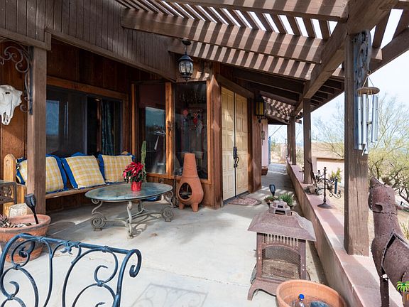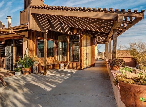 VIEWS for miles: If you've been searching high and low for a property that has desert charm, look no further! You'll feel right at home in this spacious Country chic 3-bedroom 2 bath, vaulted wood beam ceilings, cozy living room with beautiful oversize fireplace, open kitchen with pool view, master bedroom, wood burning stove, large open spaces throughout. Enjoy covered patios, several outdoor areas to relax including small amphitheater seating next to the pool that could be perfect for events or entertaining. Huge pool with Views. Horse lovers, make use of several out buildings, round pens, out buildings are rough but, could be perfect to create Western town facade or use as tack room, feed storage, you decide. All this sits on over 4.5 acres fully fenced! This Amazing location is minutes from the back entrance to Pioneertown, 15 minutes to Joshua Tree. Enjoy privacy, views, nature and space. Plenty of room both inside and out.
