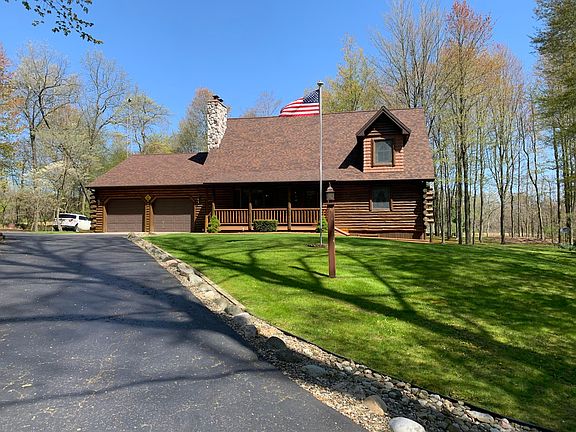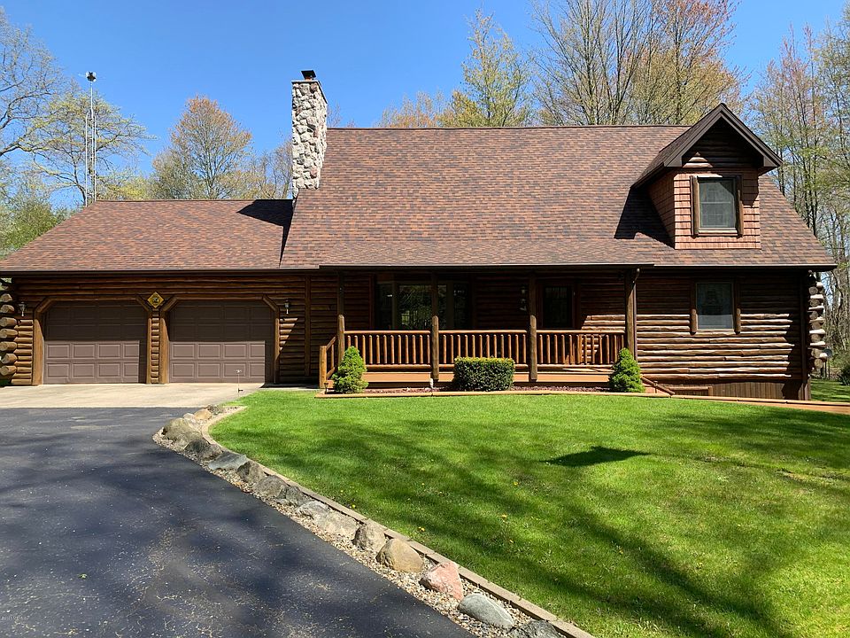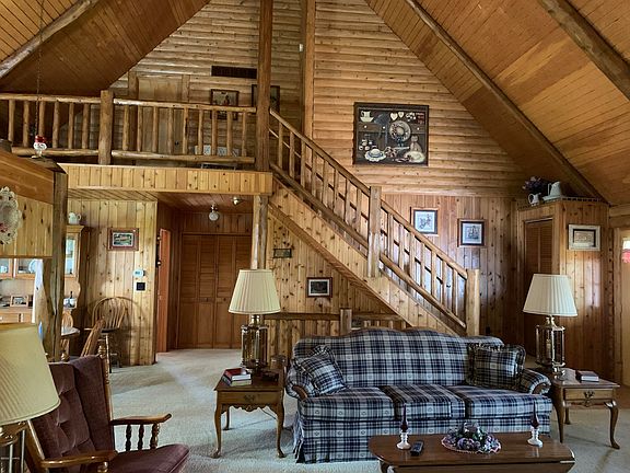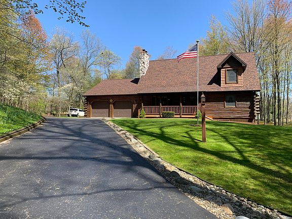 Beautiful Log Cabin Home sitting on just over 5 acres. This one owner home offers many great amenities! Private setting. Open concept, 3 bedrooms, 2.5 baths, Large kitchen with Jenn-Aire Stove. Tong & Grove Cedar on main floor. Pine on upper & lower levels. 2 fireplaces, one gas & one wood. The main floor fireplace has exterior box to put wood into the living room. Wet bar in the walk out lower level with spacious family room. Sound sound set up. Quarry Tile flooring in lower level. Also the snack bar in lower level is movable. Laundry room on main floor. Anderson Windows throughout. Two pole barns a 24 x 32 with 2- 8' doors. Second barn 24 x 32 with a 11 x 32 extension with dirt floor and a 8 x 12 additional extension with 12.6 high door for a RV. 2 tax numbers to this property