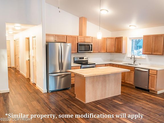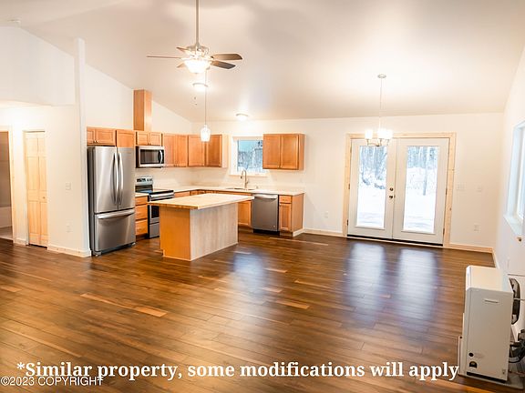 This stunning, brand new home boasts three spacious bedrooms, two bathrooms, and is situated on over two acres of wooded land. The kitchen is equipped with stainless steel appliances and a butcher block island to chop your way to culinary greatness, while the living area features vaulted ceilings, creating a spacious and airy feel to lounge in style.With triple pane windows keeping the chill at bay and an anticipated 5-star energy rating, you'll stay toasty and eco-friendly all year round. You will find plenty of opportunities to enjoy the outdoors in this serene location. Talkeetna Lakes Park is a favorite among locals and visitors alike, offering hiking trails, fishing, and kayaking. After a day of adventure, come home to relax on the back deck, which provides stunning views of the surrounding birch forest. With its charming design and modern amenities, this house is the perfect retreat for those seeking peace and tranquility in a natural setting.