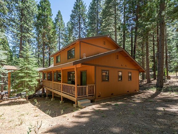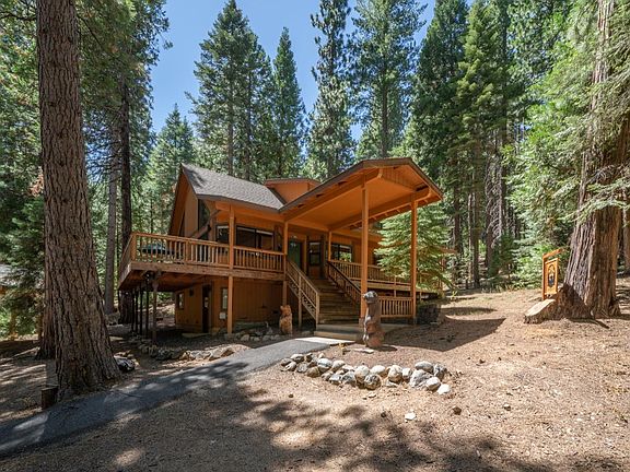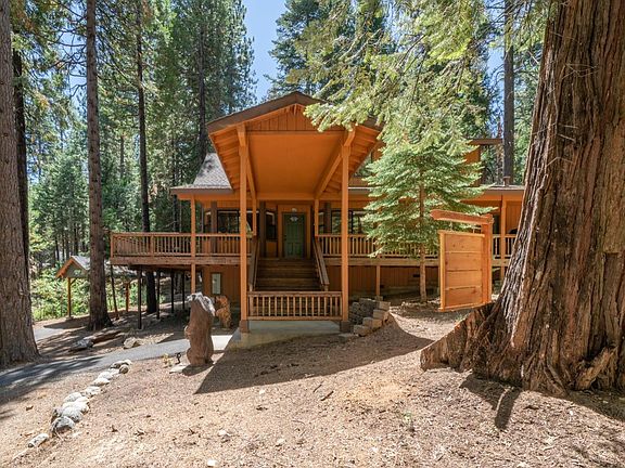 If you have been waiting for a beautiful turnkey mountain home in an idyllic location, then your wait is over. This classic chalet checks all the boxes. The 'Sequoia Ridge' chalet is situated on a half-acre lot with excellent privacy, in the nicest part of Dorrington/Big Trees Village--not too close to the highway yet not too far--with underground utilities and surrounded by a diverse array of mature evergreens including cedars, pines, firs, and majestic sequoias. The chalet's interior will impress the moment you enter its great room with high vaulted wood ceilings, exposed beams, beautiful wood floors, and wall of windows allowing you to take in the peaceful forest views. Perfect for watching the snow fall in winter and the wildlife in summer. There is plenty of room for family and friends to gather around the cozy wood stove with a custom rock wall and stone hearth. Chefs will love the open concept floor plan and preparing meals in the spacious kitchen featuring granite counters, warm pine cabinetry, stainless steel appliances, a gas range, and a breakfast bar for the sous-chefs and little helpers to sit. The large main floor primary bedroom has double closets and an en suite bathroom with dual sinks and a relaxing oversized jetted tub. There is also a half bath on the main level, adjacent to the laundry/mud room with a new washer and dryer and its own entry from the front porch. Upstairs you will find two more bedrooms with new ceiling fans, another full bathroom, and an open loft area for additional sleeping or hang out space. In addition to the chalet's original 1,932 square feet, the owners recently finished a 200+ sq ft bonus space below the main level, currently set up as a game room. The game room is accessed from the exterior and is connected to the main house's central heating system, a perfect hangout for teens or those seeking an additional getaway. There is ample storage space behind the game room for kayaks and other toys. Other features of this special property include an inviting deck with a covered wrap-around porch, a custom carport and a grand covered entry to make winter access and year-round barbecuing more enjoyable. The chalet is set back nicely from the road with a very gentle-up driveway that has plenty of parking space for guests. The oversized lot is mostly walkable and usable with a gentle slope, perfect for snow play. Optional membership in Big Trees Village HOA comes with two swimming pools, bocce ball, basketball, volleyball, playground, BBQ areas, frisbee golf, and various activities and organized events. Newer 50-year roof. This is the perfect mountain escape, ready for the next family to enjoy!