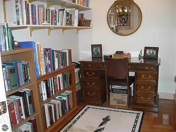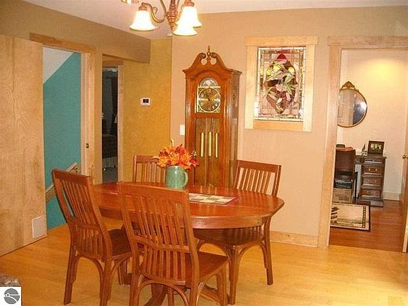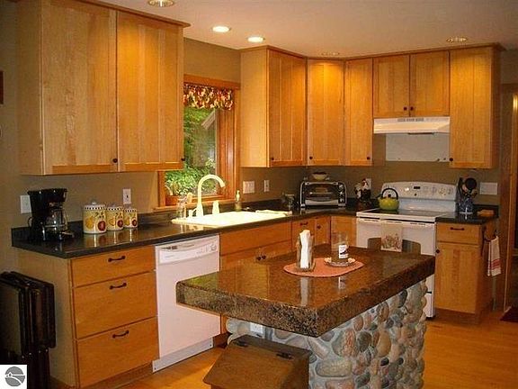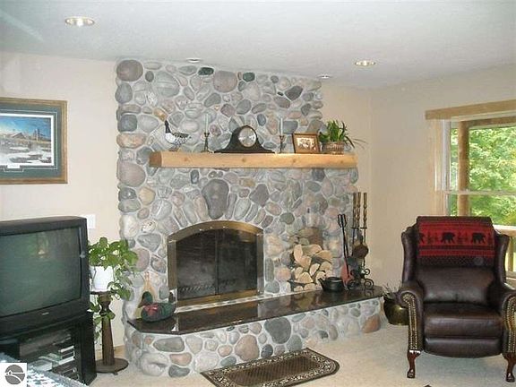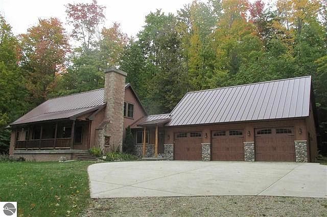 A beautiful home nestled on 10 wooded acres. The 2012 addition includes a 3 car attached garage which is insulated and has a 14x36 bonus room wired and ready to be finished, plus a mud room with a 1/2 bath. Underground electric to the home and 5" thick cement approach and turnaround area. Super energy efficient Bryant Heat Pump and forced air furnace, and 40 year steel roof are all new. Maple hardwood flooring in the kitchen and dining rooms and cherry in the office. Trim throughout house made from wood off the property. Beautiful fieldstone kitchen island with granite top as well as granite hearth on the fieldstone wood fireplace. Main floor master bedroom with private bath and walk-in closet. Two more bedrooms upstairs with a full bath and large lower walk-out level with family room, work-out room, laundry, and mechanical/storage room. Plumbed for another full bath. All 2x6 construction plus gas, oil, and mineral rights included. Beautiful covered porch to enjoy the solitude and wildlife. Only 20 minutes to Traverse City. Lower Level recently painted.