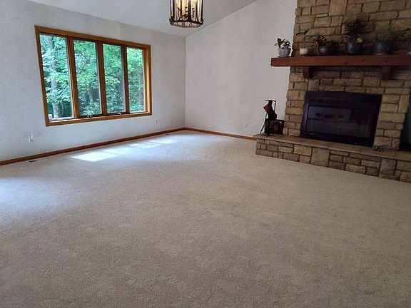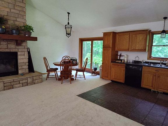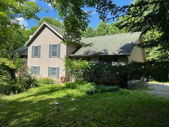 Set back off the road totally secluded - 5.49 acres. Open Floor Plan with Cathedral Ceilings. Great Room with Gorgeous Floor to Ceiling Stone Wood Burning Fire Place. Open Kitchen with Oak Cabinets Galore. Partial walkout lower level. The Pellet Stove is in lower level room for added warmth. Beautiful Home ready to move into with a Private Well, Leach Field, Aeration Tank, Septic Tank.