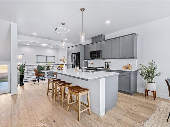 As you walk into the front doors you're greeted by hardwood floors that flow up into the kitchen. This well lit kitchen features gray shaker-style cabinets, quartz countertops, a breakfast bar with pendant lights, and modern black stainless-steel appliances.