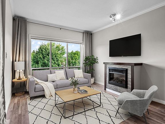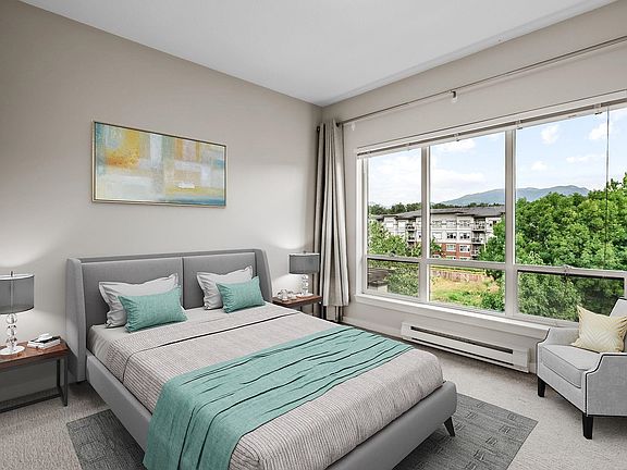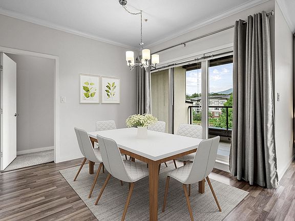 Top floor living! 9' ceilings, big windows for natural light & mountain views over the tops of trees, and a wide layout. Very private unit - storage room on 1 side & stairs on the other, no one above, & large inset balcony. Bright & efficient 710 ft2, one-bedroom plan allows for well-defined living and dining spaces within the open concept layout, a peninsula kitchen with bar seating, granite counters, stainless appliances, and huge pantry, a large bedroom with incredible walk-in closet, and spacious, covered balcony. Incredible Gates Park is just outside your door with trails, sports fields, tennis courts, and more, and adorable downtown PoCo is less than a 10 minute walk. 1 parking. 4 EV chargers. 1 locker on the same floor! Pets and rentals allowed. OPEN HOUSE CANCELLED for OCT 15.