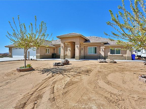 Your New Home Awaits! Extraordinary home located in Apple Valley with amazing never-ending Views of the Mountains and Beautiful desert. This home boasts 4 bedrooms, 3 bathrooms PLUS an office. Situated on 4.3 Acres that is fully fenced with 3 RV gates on the back fence for access, plenty of room for all of your toys and extra parking! Beautiful tile entrance and formal dining room accented by crown molding flows into the large living room with cozy pellet stove fireplace and cathedral ceilings. Enter into the Gourmet Kitchen with custom cabinets, double oven, range, ample amount of cabinet space, large island with breakfast bar, beautiful pendant lighting and is open to the living room and another spacious eating area. The master suite features custom dual sinks, jacuzzi tub and walk in shower. Large bedrooms and bathrooms perfect for guests and an office ideal for working at home. The property also features CAT 5 wiring throughout, newer A/C and Heater, tankless water heater, plumbed for radiant heat, 2 ducted swamp coolers, etched windows, indoor laundry room, a Barn with electrical and well house. Ideal man cave in the garage with custom country bar and sitting area! Enjoy the Gorgeous desert sunsets on the wrap around covered patio with plenty of room for BBQ's. Homes like this are few and far between!