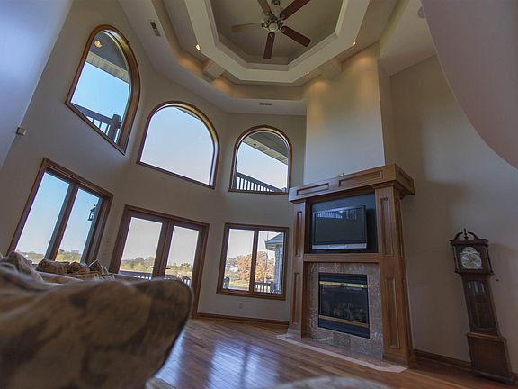 Pull into the wooded driveway with mature trees that opens up to immaculate views of this divine stone home and the gorgeous pond just off in the distance, you will truly immerse yourself in a feeling of seclusion. Step into the home and onto all of the Italian marble detailed flooring throughout the home. The soaring ceilings and massive windows in the main living area allow for beautiful views of the rolling hills surrounding the pond and 39 acres of land. A formal dining room off the foyer and another option for seating off the kitchen with 180 views offer lots of room for entertaining. The kitchen features a walk in panty with automatic lights and more rear facing views of the land behind the home. A sizeable laundry room and half bath are featured near the kitchen, as well as the 4 car attached garage. We're not done with the main floor yet! On the opposite end of the home is the master suite, and boy is it sweet! Notice the tray and vaulted ceilings atop the windows overlooking the best view in the house! Walk across the hall to your bathroom oasis. A tub overlooking the front yard, a glass block shower, and two separate vanities highlight the master bath. From the master bedroom, head out the doors leading to the large deck that also allows access to the living room. From the deck, head down to the lower level basement entrance. A wet bar, cinema room, and another kitchen with a built in gas grill are featured here, and all lead to a large open concept room. A bedroom with a private entrance and a full bath highlight the north end of the basement. Let's take the elevator up to the second floor! First, there are two bedrooms with an attached jack and jill bath and a walk in closet. Then head down the hall across the catwalk bridge to another bedroom with an en suite. Both bedrooms facing the west have an attached balcony. Take the stairs back to the main level, or take the elevator, the choice is yours. The virtual tour may be over but if you think the pictures are beautiful, you should see it in person! Take a tour to truly immense yourself in the beauty of this home and the surrounding property. Green grass and trees for as far as the eye can see, a country feel and it's even close to downtown Fremont. Tons of land for whatever your heart desires, a pond for endless summer fun & possible winter use, and an immaculate home to go with it. This home truly has it all, and then some!
