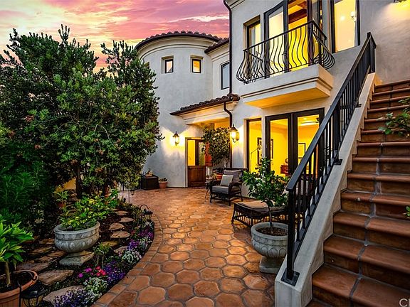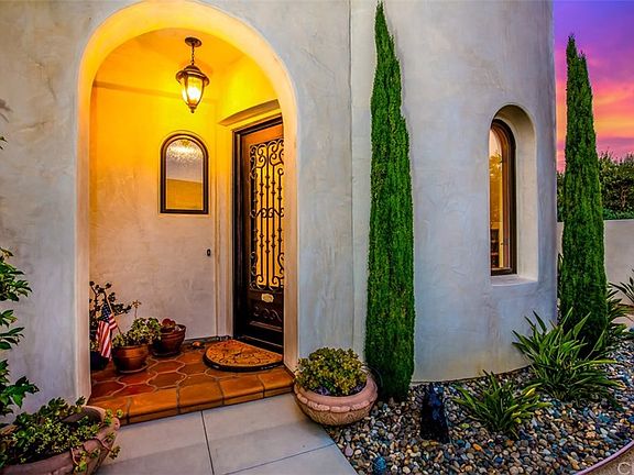 Modern Spanish style and endless ocean views define this luxurious Lantern Bay Estates home, nestled in the private gated community overlooking the Dana Point Harbor. Custom-built in 2016, the lavish 2-bedroom estate showcases mesmerizing panoramic views of the crashing waves, colorful sunsets, and city lights. Enter through a lush courtyard to a beautifully remodeled master suite with a spa-like bath, as well as an exquisite ocean view private OFFICE complete with patio to create a peaceful remote workspace. The well-appointed floor plan has the main living on the upper level, accessible by an elevator or a custom tiled winding staircase. The gorgeous open floor plan highlighted by rich wood-beamed vaulted ceilings, wrought iron chandeliers, railings, and terra cotta tiled floors carries the fresh Santa Barbara style throughout the home to create a cool coastal elegance. A sumptuous and stylish great room centered around a grand tiled fireplace opens to a spacious kitchen on one side and nano doors on the other for seamless indoor-outdoor living with an abundance of natural light. The posh gourmet kitchen is appointed with granite counters, an oversized island, breakfast bar, abundant storage, stainless steel appliances, and more vaulted wood-beamed ceilings. Complete with a 4-car garage, this beach close luxury home encapsulates the quintessential coastal lifestyle, located just a stone's throw from the Harbor, world-class beaches, restaurants, and shopping. Virtual Tour