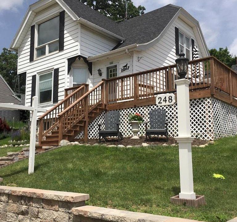 This old world charmer is located in the heart of downtown Fontana. Short walk to Gordy's, Chuck', Beach, Park, Abbey Resort and many water activities on Geneva Lakefront. Come sit on the oversized new deck with incredible views overlooking downtown and the lake. This home boast 3 large bedrooms, 2 baths, and cathedral ceilings in the dining room and one of the upstairs bedroom. The character is here just needs some updating. Very solid and well cared for home! New furnace and air in 2019, new windows in dining room, and new deck. Possibility of driveway to left of house.