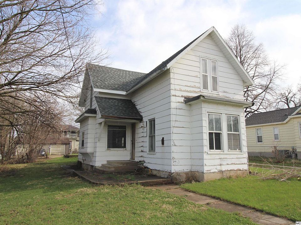 READY FOR A PROJECT? Some elbow grease and this home could SHINE! A first time home owner renovation project or investor special - YOU CHOOSE! Newer roof on both the house and garage. Nice newer kitchen cabinets and countertop. Parking off both the street out front and alley out back, the cement pad accommodates extra cars and visitors behind the garage. Whether you walk in the front or the back door, you have an open line of sight through the entire main floor: living room, dining room, and kitchen. Bonus seating built in seating space along the dining room wall. Spare bedroom off the dining space. Two large bedrooms, a full bath, and spare closet are upstairs. Utility and laundry area are in the basement just off the back door. Paint, flooring, windows, and siding are just a few of the tasks that remain to take this one back to its glory days. Cheaper than rent even after updates - make a call to your Realtor. Property being sold 'AS IS.'