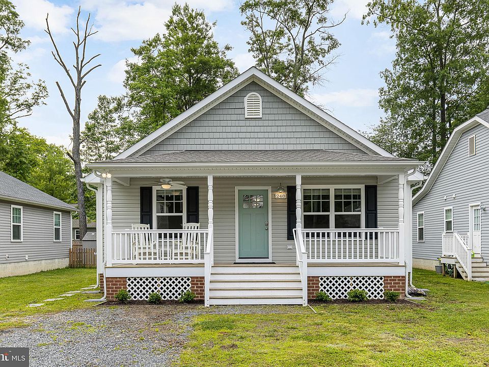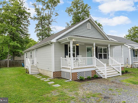 You'll fall in love with this charming 3 bedroom, 2 bath move-in ready home! You'll enjoy the open floor plan with cathedral ceilings in the kitchen, dining and living areas. - perfect for entertaining! Kitchen boasts upgraded stainless appliances, countertops, over breakfast bar lighting. The Primary bedroom has an ensuite bath with a 5' glass shower and two vanities. A separate laundry room and a large linen closet round out the floorplan. Have your morning coffee or evening cocktails on the large covered front porch. Great location - just a golf cart ride away from downtown, beaches, shops and restaurants. A short commute to Dahlgren and easy access to So. Maryland, Fredericksburg and Richmond. Book a showing soon!