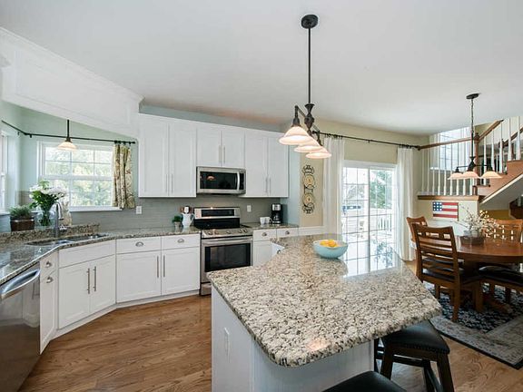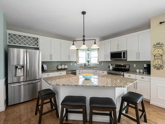 - RoomKitchenFeatures: Granite Counters, Kitchen Island, Breakfast Bar, Eat-in Kitchen, Custom Cabinetry, Breakfast Room, SolidSurfaceCounter