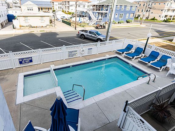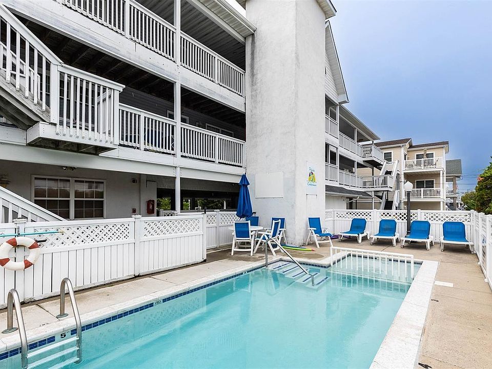 A RARE FIND - OVERSIZED TWO BEDROOM, TWO BATH CONDO WITH POOL & ELEVATOR CLOSE TO BEACH! This well maintained Poolside Condominium is an opportunity not to be missed in an ideal location - just 2 blocks from Wildwood Crest, and the beach and boardwalk are just 2 short blocks away. Local restaurants, stores, ice cream parlors, miniature golf and more attractions are all within close proximity, making this an ideal rental investment or second home - and the size makes it suitable for year round living as well. You'll appreciate having an elevator to arrive at your condo, being greeted by a large outdoor deck with plenty of seating, where you can enjoy the evening ocean breezes and the morning sun. Inside you'll find a spacious and open layout with a large living space with tile flooring, a fully equipped kitchen with snack bar, and adjacent dining area. The primary bedroom has a walk-in closet and private bath with tub, with an additional bedroom and bath off the hall. Both bedrooms have beautiful hardwood floors! Enjoy a washer and dryer in the unit for convenience and forced air heat and central air for year-round comfort. The rooms in this condo are all generously sized, and the unit is offered furnished and with appliances, so you can just move right in. Two car covered parking is an amazing feature included with this unit. The condominium fee covers exterior insurances for fire, flood and liability, water, sewer, pool care, exterior lighting and general maintenance items. Storage for your beach items in a bin is included in the back of the property, marked as such, and that is included in the sale. A ramp leading to the elevator offers wheelchair accessibility. While this condo does not have any rentals for next season, the condos at Poolside Condominiums have a strong rental history with other units renting at approximately $2,000 - $2,200 for prime rental weeks. This is the perfect unit for personal use or investment, or both and is easy to see - call today! *NOTE: Please note that the square footage was taken from tax records and should be verified by Buyer prior to purchase. * There is a special assessment due in two installments - $750 due 12/24/24 and $750 due 3/25/25.