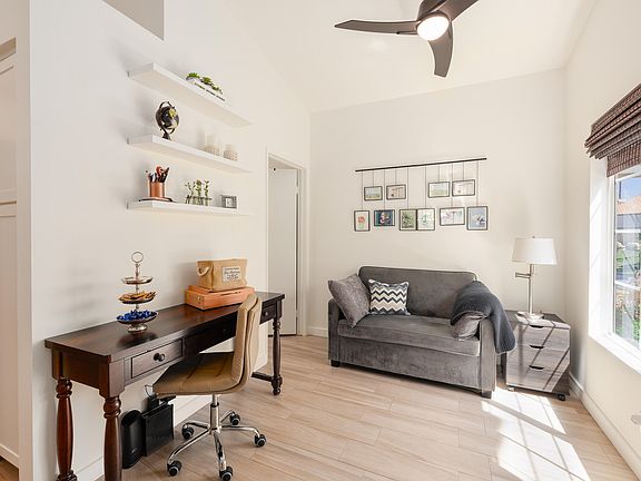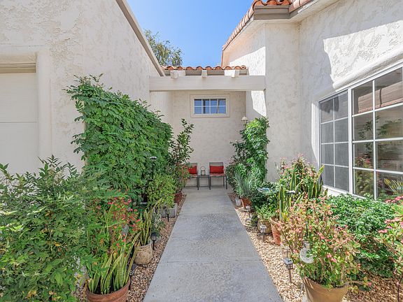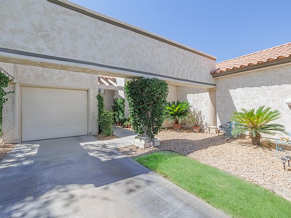 Beautifully remodeled, south facing condo ideally situated with private, park-like views. Rare, 1 bedroom, 1-1/2 baths, single level end-unit, with long driveway, conveniently located at the end of a cul-de-sac. The Saltillo-tiled rear patio is sunny much of the day, with views of the nearby community pool. The interior has been tastefully remodeled and includes an inside laundry room. The light and bright kitchen boasts a gas stove, quartz countertops, full backsplash, soft-close cabinetry and stainless appliances. Large den-like area adjacent to kitchen. Neutral, wood-plank look tile throughout most of the condo. Primary bath features dual vanities and quartz countertops. Rear patio access from the primary bedroom. Shutters grace windows & sliding doors. Lighting has been updated throughout much of the condo. Newer HVAC system. W/D, fridge, and microwave all purchased within the past year. Exceptionally clean and well-maintained. Short term rentals are approved in Desert Falls. Homeownership includes WiFi and Cable, tennis, pickleball, a complete fitness facility, and 24-hour guard-gated security. The privately owned Desert Falls CC offers pay-as-you-play or membership options. Desert Falls is perfectly located mid-valley, close to dining, groceries, and retail. Within minutes of the renowned AcriSure Arena - a premiere venue home of the CV Firebirds hockey team and hosting the biggest artists and acts on the planet.
