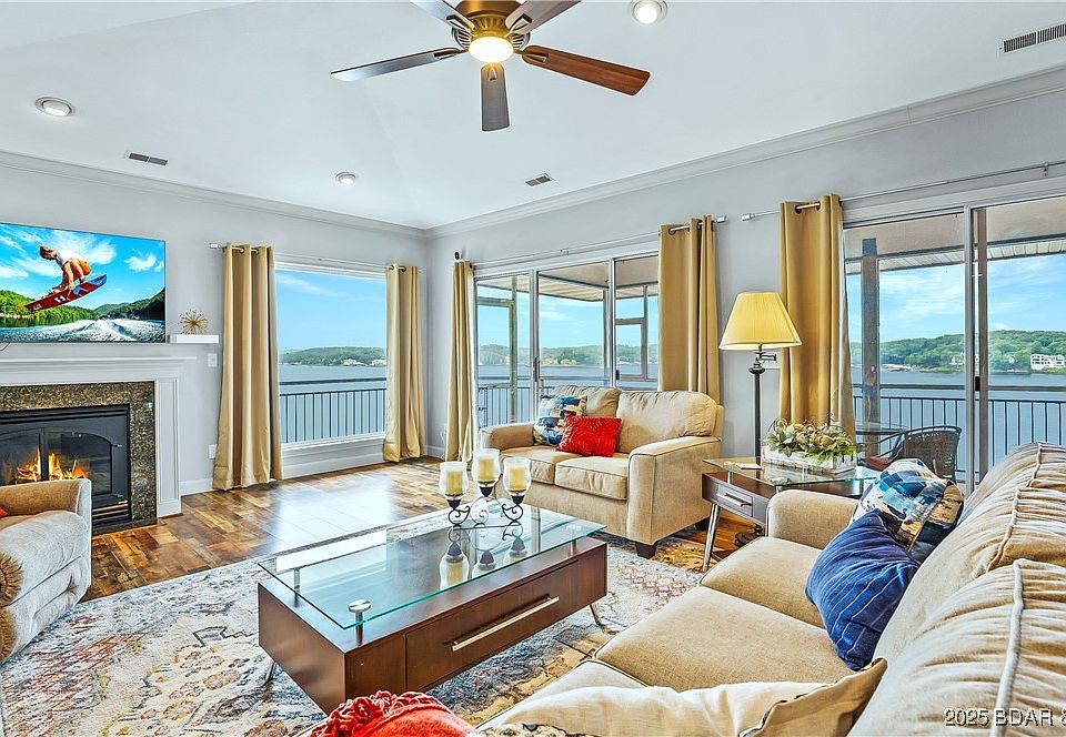 Unmatched Privacy & Comfort with this 1800+ sq. Beautifully Transformed Top Floor, End Unit at Palisades! THIS UNIT CAN BE RENTED! Captivating Views that never get old! This residence offers one of the most secluded settings in the entire community. Step into the chef-inspired kitchen with all-new custom cabinetry, sleek hood, SS appliances, LED lighting, & smooth Corian Tops. Updates include LVP flooring, plush carpeting & premium padding, plus refined crown molding & base trim for an upscale finish. The primary suite is a true retreat with a redesigned & renovated bath showcasing an oversized walk-in shower, dual vanities with designer mirrors, updated plumbing, fixtures, and a Dream custom walk-in closet. The guest en-suite boasts a refreshed bath with a new walk-in shower, vanity, countertop & lighting. Bath 3 delivers a bold design statement with custom floor to ceiling tile. Gas fireplace adds ambiance & charm. Gated community with resort style amenities, 3 Pools & fabulous Clubhouse. Boat captain will love the 12 x 32 slip and wave break. Perfect location near shops, golf, dining & Bagnell Dam Strip. Furnished - Everything inside stays! Garage available for extra $.