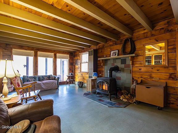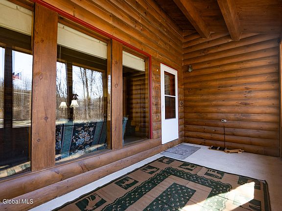 The log home is located on 3/4 of an acre, just minutes from I-87, yet it provides the feeling of country living. The home features three bedrooms, including a first-floor master, an open living area with a woodstove for cozy nights, a lovely screened-in front porch, a detached garage with a carport, and a circular driveway. This property won't be on the market for long.