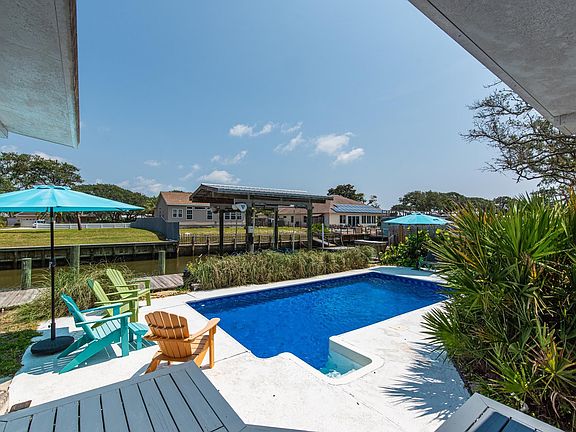 Every day is a vacation day at 248 Hildago Rd! This is the perfect location to enjoy the St Augustine life! So much to do! Swim in your pool, launch your kayak from the floating dock or take your boat out to the intracoastal. There's even a private deeded beach access just a short walk away. When the day is over, rinse off with the outdoor shower (hot & cold water) or relax on one of the enclosed porches, both with views of the canal & pool. The non-slip tile on the side porch is just what you need in this home by the water. The interior has been updated with new doors, windows, luxury vinyl plank flooring in living areas, ceramic tile floors in the bathrooms, granite counters and all new cabinetry in the kitchen & baths. The kitchen features stainless appliances, soft close cabinets & a full size washer and dryer tucked away in its own space. The primary bedroom has a walk-in closet and an en suite. The two guest bedrooms at the front of the home share the second bathroom. There's room to store all of your water toys, bikes and fishing rods in the spacious shed. The carport gives you shade for your car and the covered boatlift (6000 lbs) keeps your boat protected from the elements. The roof was replaced in 2015, HVAC in 2017, water heater in 2018, and pool liner in 2022. This is the perfect retreat for boaters, beach lovers and anyone looking to live in paradise! Some furniture conveys. This can be your primary home, vacation home or investment property. There are no restrictions in Treasure Beach. 248 Hildago Rd is just a short drive to historic St Augustine, the Amphitheater, Alligator Farm, the Lighthouse and many great restaurants.