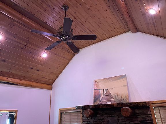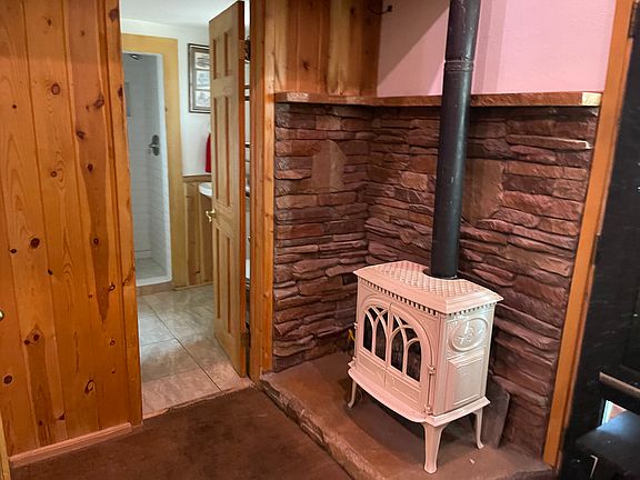 Freestanding gas fireplaceNice porch seating areaFull kitchenOne bathroomLarge desk with stoneCeiling fan