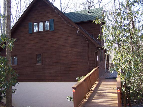 GREAT VALUE/RENTAL - Large, cozy, well maintained A-frame with easy ramp access, great rental history, central HVAC, & large basement garage, offers its owners & guests a quiet private retreat in beautiful Powder Horn Mountain. Ideal for large families with a large master bedroom suite & sitting/sleeping area on the upper level, a main level bedroom & bath, & a lower level bunk/den/game room & bath. The main living area has T&G walls & high vaulted ceiling. The stone gas log fireplace provides heat & ambiance & can be easily converted back to wood burning mode. Large galley kitchen offers a big eat at bar next to the open dining area. Powder Horn Mtn. is a well established gated resort & residential community offering a large rustic clubhouse, a lovely chapel, 3 stocked fishing & boating lakes, sports courts, kid's playground, rustic camping & picnic area, a pristine native trout stream & access to a trail system with miles of well maintained hiking trails. Just 6 miles from the Parkway & short drives to Boone, Blowing Rock, the Jeffersons, the Wilkesboros, Lenoir, Hickory & Piedmont