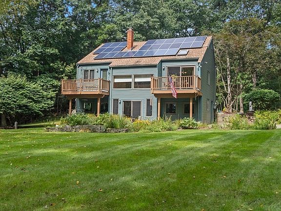 Nestled amidst the natural beauty of Boxford, this 3 bedroom, 2 bath contemporary home offers modern living in a tranquil setting. Situated on a sprawling 3.06 acre parcel, this home boasts a contemporary design with clean lines, abundant natural light, open concept living spaces, 2 decks, a storage shed and solar panels contributing to lower energy costs. The charming patio is a serene setting for relaxation. Surrounded by landscaped gardens it is an ideal spot for unwinding after a long day. If you’re looking for a well maintained modern retreat on a generous parcel of land, don’t miss the opportunity to make this property your own.