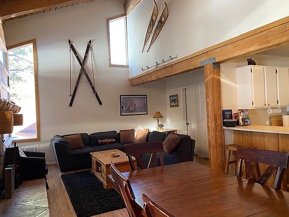 Located in upper row, which backs to USFS and mountain bike trail and ski back trail. Beautiful forest views. Close to Canyon Lodge. Gas fireplace with nice rock and log mantel, no upgrades required. Open vaulted ceilings for a spacious feel, wood beams have been sandblasted. Kitchen opens to dining and living area with nice forest views. Corner unit gives 2 extra side light windows and only 1 common wall. Master has its own private bath, and also has forest views and vaulted wood ceiling. 1/2 bath off living area. Upstairs has full bath with double sinks, and 2 sleeping areas, also boasts wood ceilings. Project offers assigned garage parking, and open parking. A ski locker on the first floor with 4 ski lockers. Project has pool, Jacuzzi, hot tubs, tennis court, volleyball, basketball, horseshoes, and picnic area. Ski to your condo at the end of the day. Hallways make for lower utility bills. Laundry located in each building. HOA includes basic cable and internet. Please follow proper COVID 19 protocal for showings and buyers are requested to wear masks. bit.ly/2AZM6dl