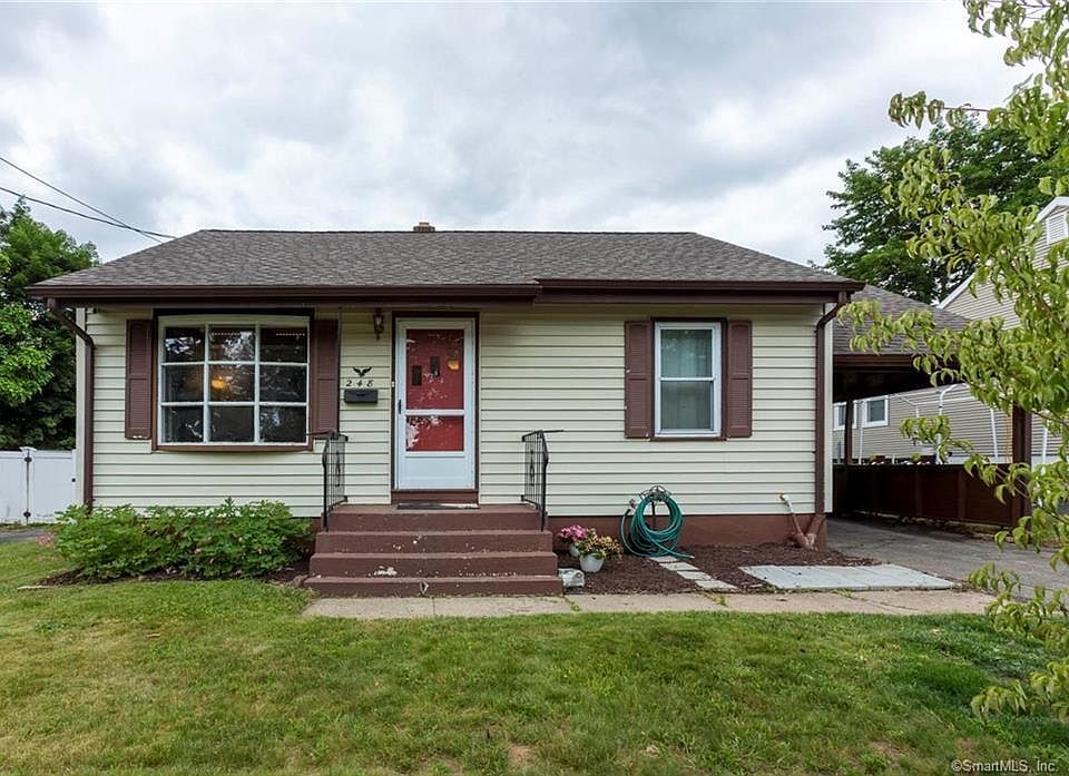 Enjoy one floor living in this adorable two-bedroom Ranch. Beautiful hardwood floors are a welcoming sight as you enter this home. The eat-in kitchen is an ideal place to gather at the end of the day and is equipped with all the appliances needed to prepare your meals. An additional dining area adds great space for all your gatherings. The den with built-in bookcase is the place to escape to with a pellet stove that makes it extra cozy in the cooler months of New England. Newer roof, newer hot water heater, newer disposal, and solar providing you electric savings. An updated bathroom and generous-sized bedrooms that provide you with the comforting atmosphere you are searching for. A heated basement offers many possibilities. The French door off the den delivers you to the fenced in backyard a perfect place for your dog to safely explore, to gather for barbeques or to simply enjoy the warmer months of the year. The location is conveniently located near shopping, restaurants, schools, and parks, and allows for easy access to all commuting routes. Looking for a condo alternative, this is it. Amazing value and great space!