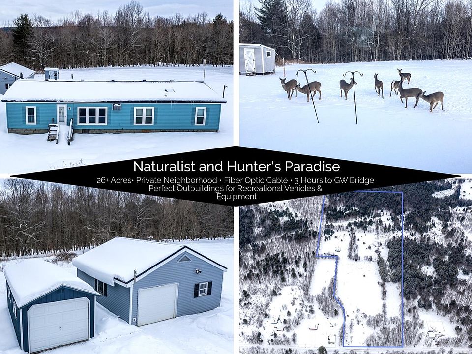 Have you dreamed of owning your own land deep in the Catskill Mountains, rich with wildlifeand vegetation? Look no further, you've found a hunter or naturalist's paradise! This home is loaded with animals, birds, flowers, sunshine, and serenity.Located just 3 hours from NYC this home offers many opportunities for sportsmen and families alike to enjoy the great outdoors. Several ski mountains are not far away and snowmobile trails and State Forests abound. The forest on the back of the lot has not been logged and there are reports from foresters of high-value trees there. There is also a good possibility that there is bluestone shale that could provide a natural resource to anyone so inclined to harvest. All rights to the natural resources have been kept by the seller to pass along to the buyer.The doublewide is anchored securely to a cement slab. The tall windows and cathedral ceiling in the center of the home maximize the natural light that often streams through the windows. It is a common occurrence to see a herd of deer or a flock of turkeys meandering by the house. The two decks provide countless opportunities for outdoor enjoyment.The home is efficient, functional, affordable, and provides ample space. It has a kitchen, dining area, living room, and family room with three bedrooms and two full bathrooms. There are plenty of closets for storage as well.The outbuildings - two-car garage, storage shed, and chicken shed - all have power to them making them great as workspaces, for parking cars or storing equipment.The garage has one bay sheet rocked and can be easily heated if so desired. It is currently used for additional food storage but could be used as a 2nd bay if so desired.The hot water is a tankless gas Noritz system. Three AC wall units cool the home. The siding is vinyl and the roof for the house and three outbuildings are metal. High speed internet available.This gem has much to offer the discerning buyer. Call to schedule your in-person or virtual showing today!